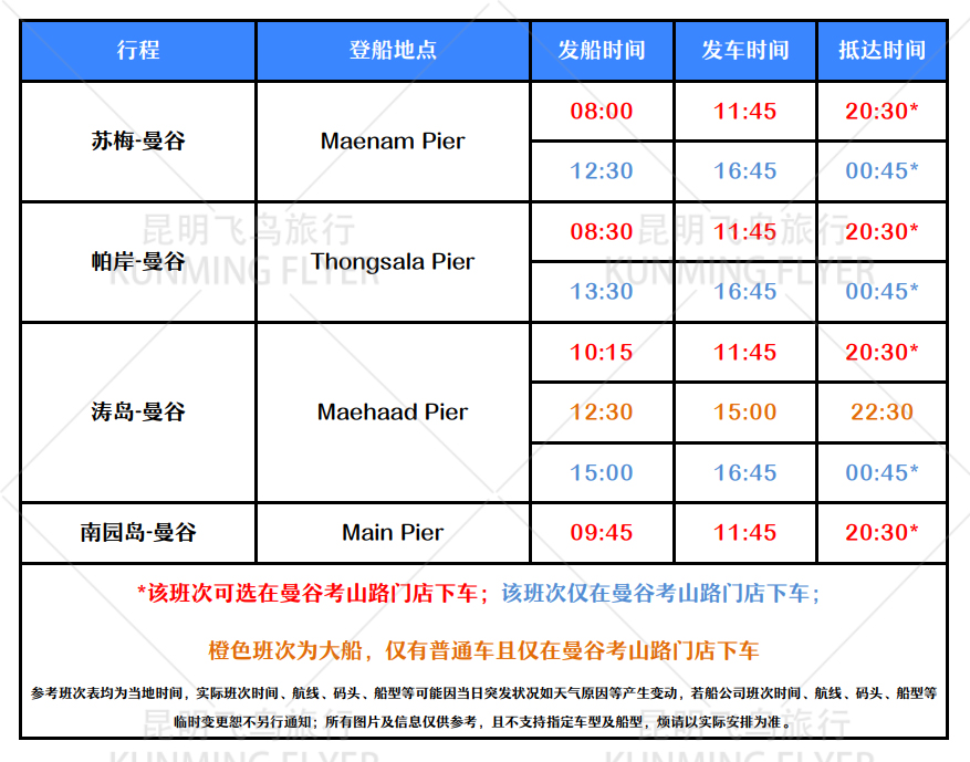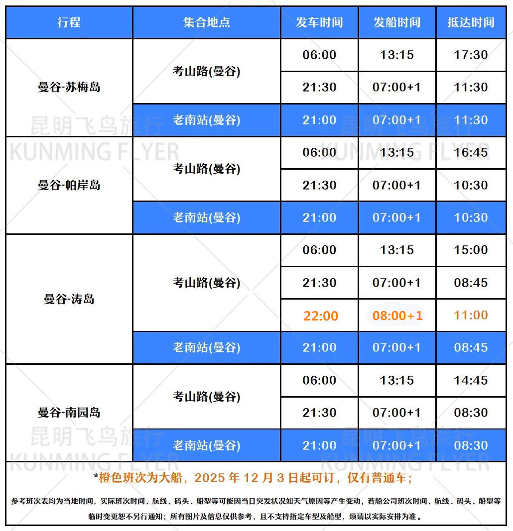 4. 上述时间均为商品当地时间,班次表仅供参考,具体时间可能因天气、路况等原因而变化;